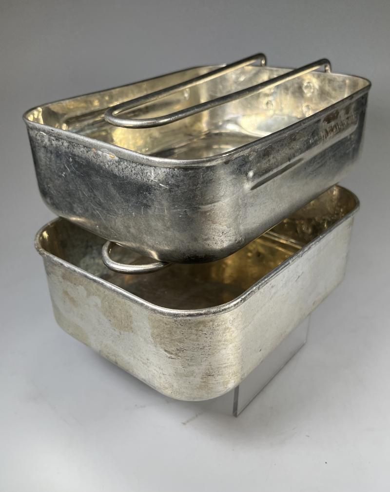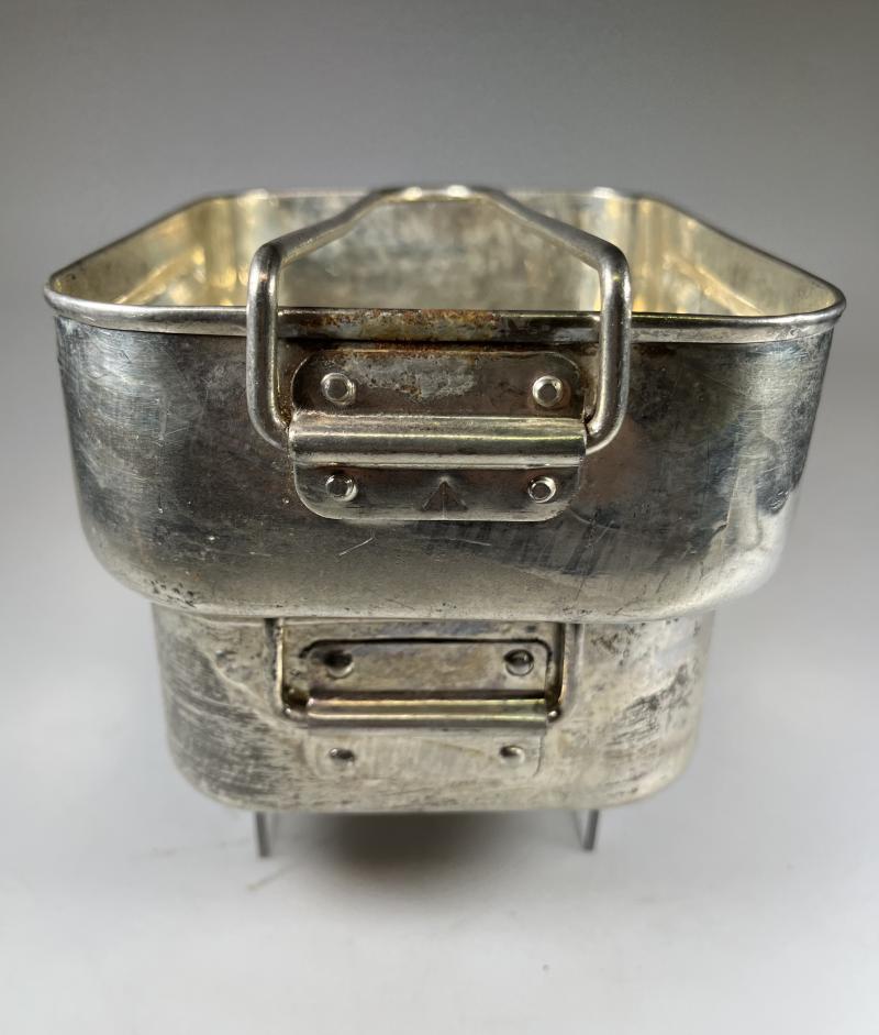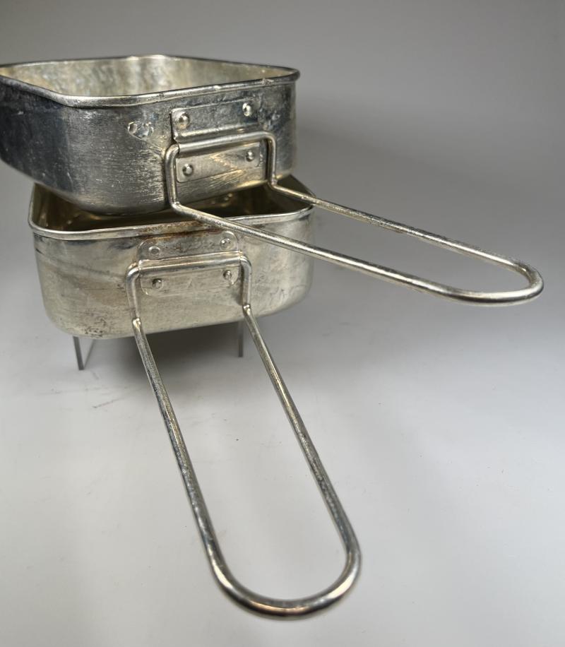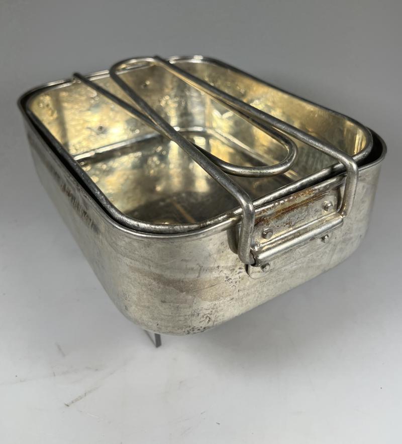 The British Army, on introduction of the 37 Pattern Kit, decided to replace the older D-shaped mess tin for something more suitable to modern warfare. They adopted a rectangular pair of nesting aluminium tins with a folding steel handle. These proved to be lighter and more hygienic than the older model, however, these were quickly withdrawn to use the aluminium for aircraft production.
