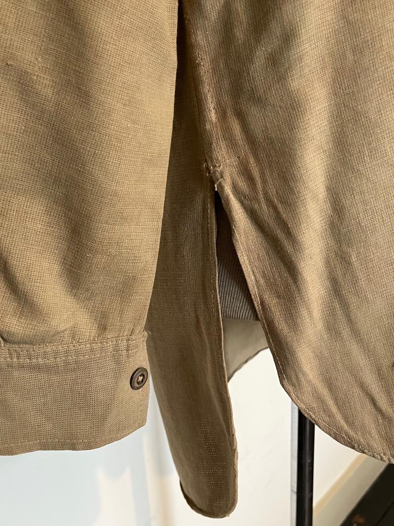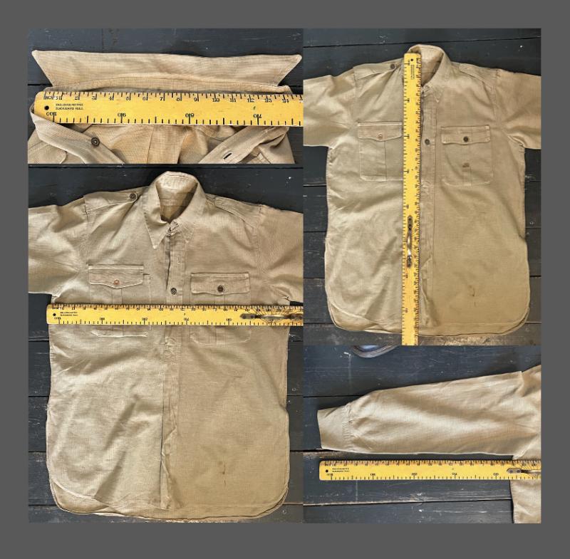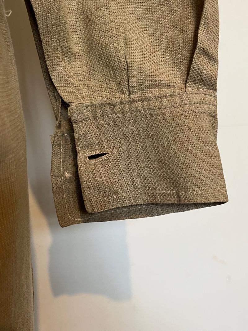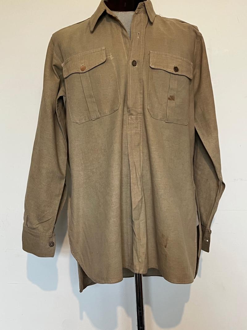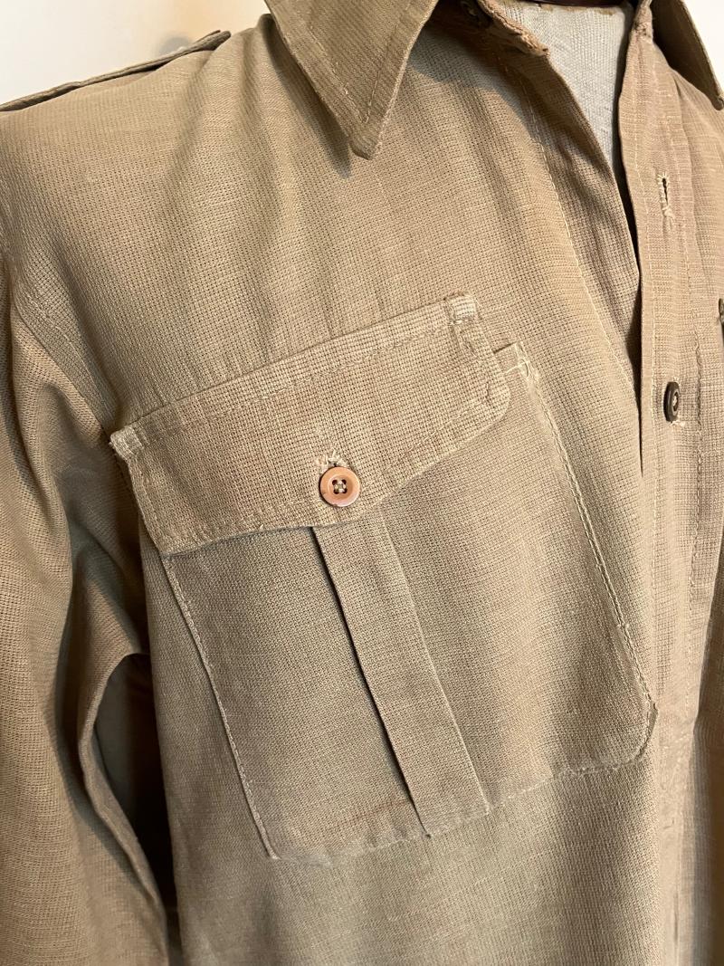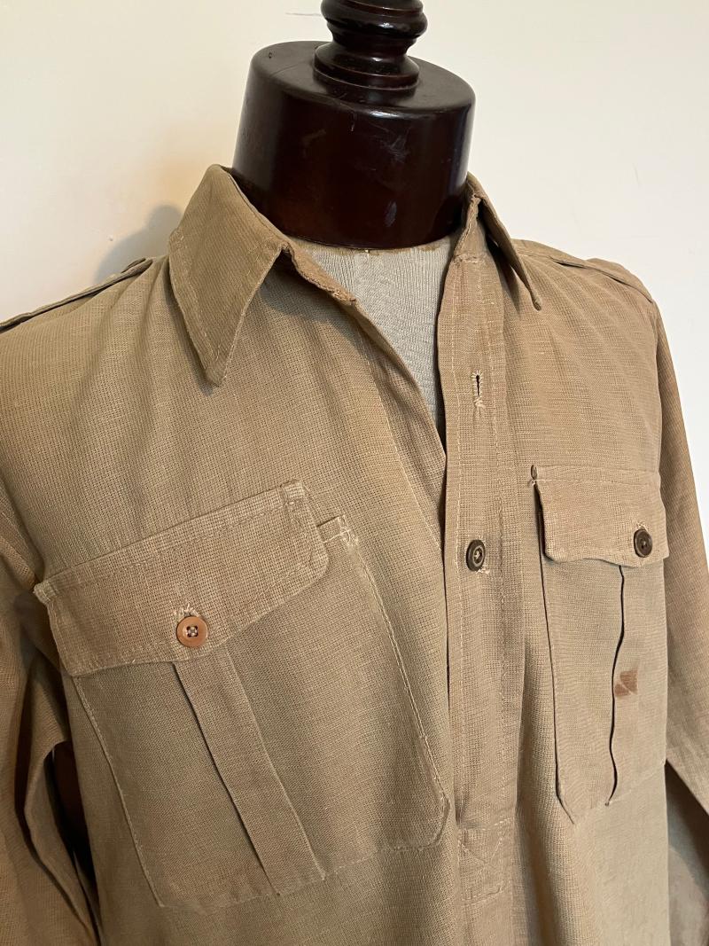 Patterns vary immensely as many were made by local contractors and shops. Most of the shirts had integral collars with buttons halfway down the front, were a pullover style, worn tucked into trousers or shorts and had two pleated breast pockets. The buttons are made from hard rubber with shoulder straps being held by loops that allowed them to be removed.