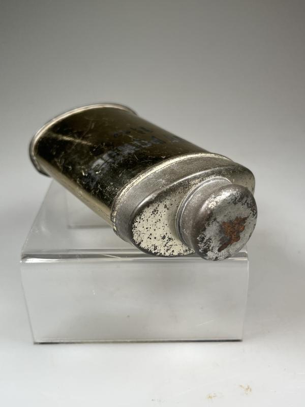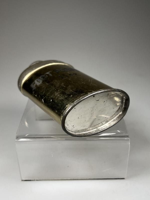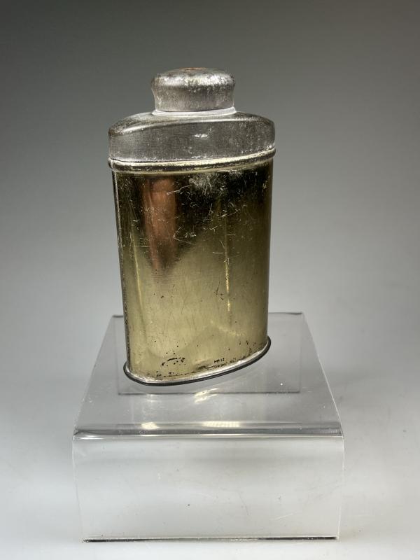 Identified as early war period by its ‘gold’ colour and black letting, later tins were coloured dark green with lighter green lettering, this tin still contains its foot powder and is in clear bright condition.