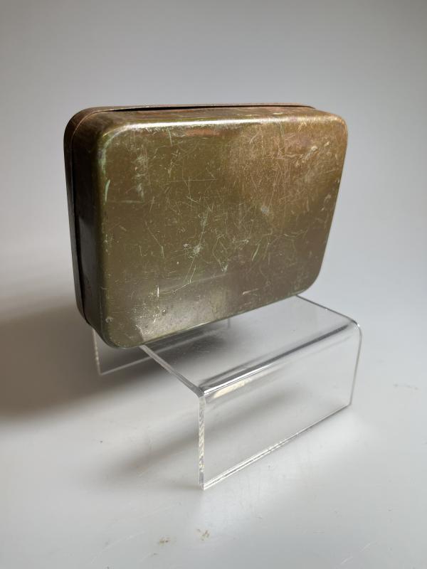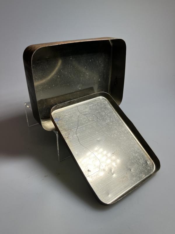 This example is in ‘GOOD’ condition, with only minor scratches and some rust spotting consummate with age and few if any ‘dents’ and is now a rare survivor; many were kept to store cigarettes and other ‘pocket’ items that needed to be kept dry. and is now a rare survivor; many were kept to store cigarettes and other ‘pocket’ items that needed to be kept dry.