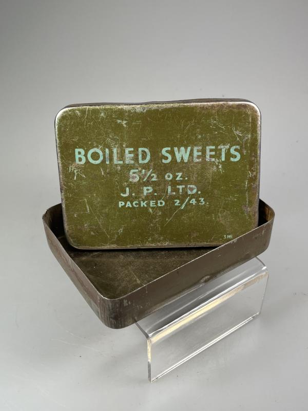 British ‘Boiled Sweets’ issue ration tin, 5-ozs, packed in February 1943 by J.P. Ltd. Later war pattern with larger font size in ‘pea green’ with dark ‘khaki’ background