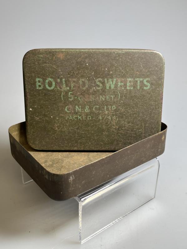 British ‘Boiled Sweets’ issue ration tin, 5-ozs, packed in April 1944 by C.N. & C. Ltd. Later war pattern with larger font size in ‘pea green’ with dark ‘khaki’ background