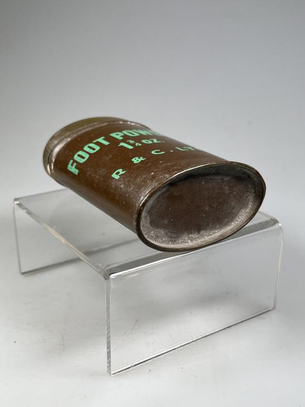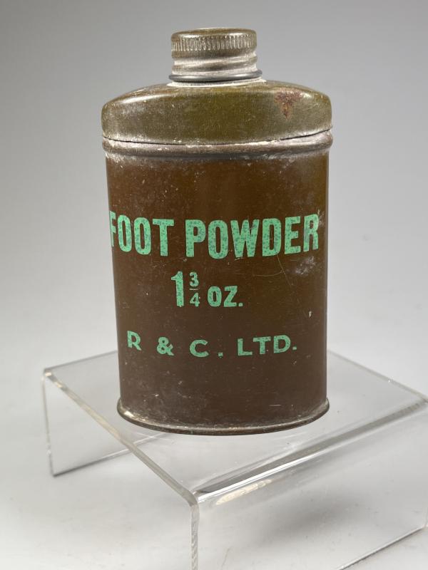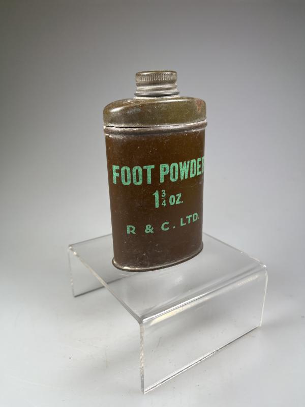 Foot powder was an essential issue of the British army and was used by soldiers to keep their feet dry and free from fungal infections. All the standard tins held 1 3/4 ounces of powder and can be found in round, rectangular and oval tins.
