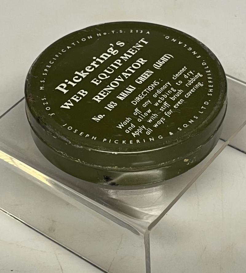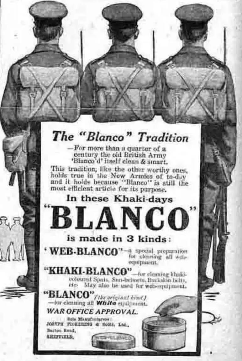 Blanco was used to clean and waterproof webbing in the sense that it covered stains and gave the webbing a consistent appearance. First the dirt needed to be brushed off then an even coating of the wet Blanco could be applied with a sponge or small brush, common practice was to use an old tooth or shaving brush. Once dry it could be lightly brushed to remove any excess. N.B. only the outside surfaces of the webbing had Blanco applied, this kept the Blanco off the uniform and avoided any staining.