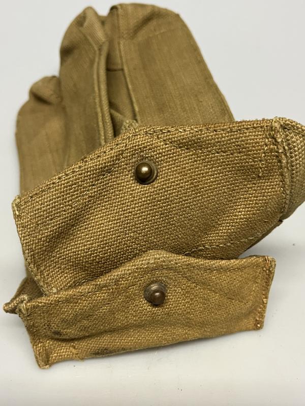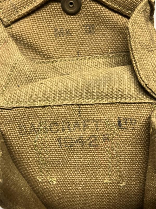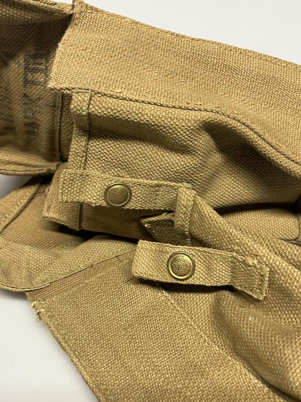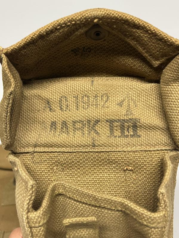 At least three different Mk’s. exist, the difference between Mk’s. 1 & 2 being that the fixing for the double hook was moved down; it was found that in the original design that the bottom of the Pouch interfered with the wearer’s waist and thigh, moving the double hook down had the effect of raising the base of the pouch up. The Mk. III differed only in that the height was raised to accommodate the new ‘Sten’ gun magazines, however, some later war and post-war examples have a quick release closure that replaced the brass snap fixing.