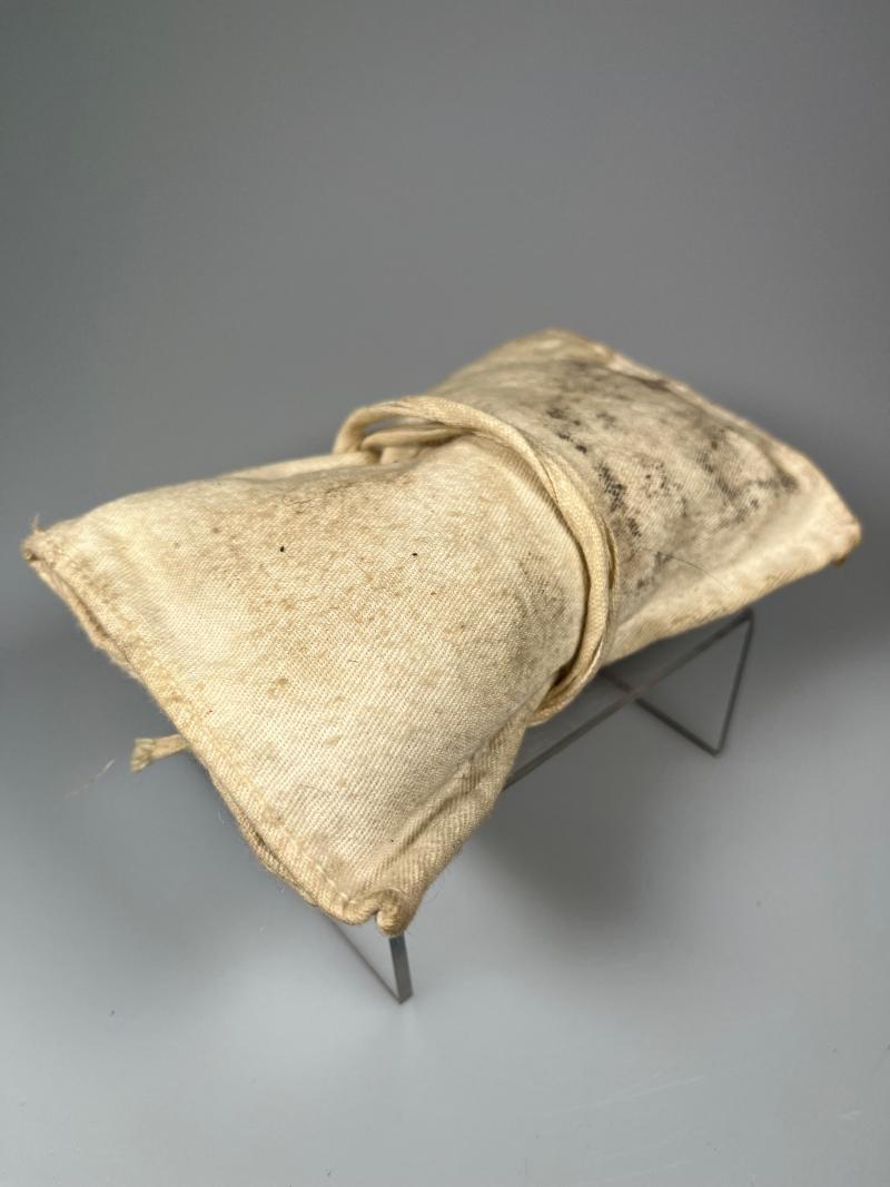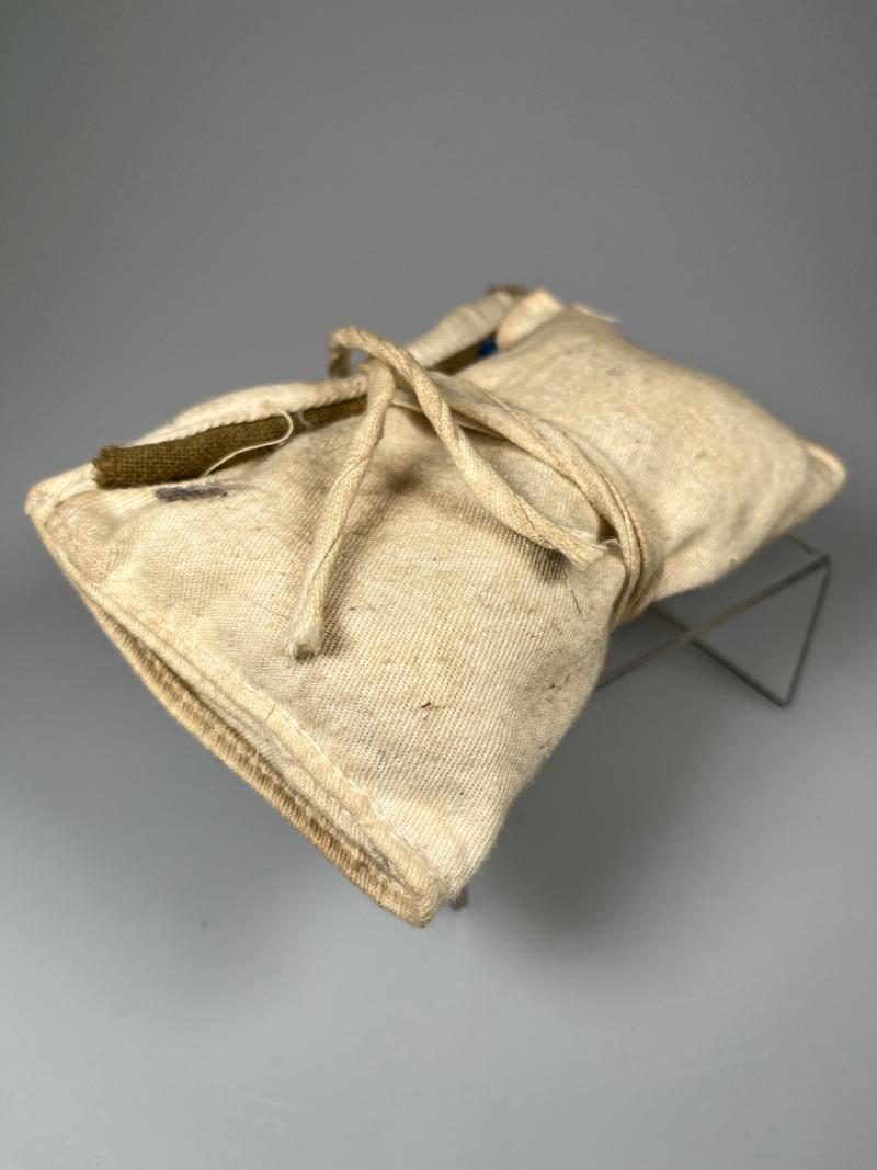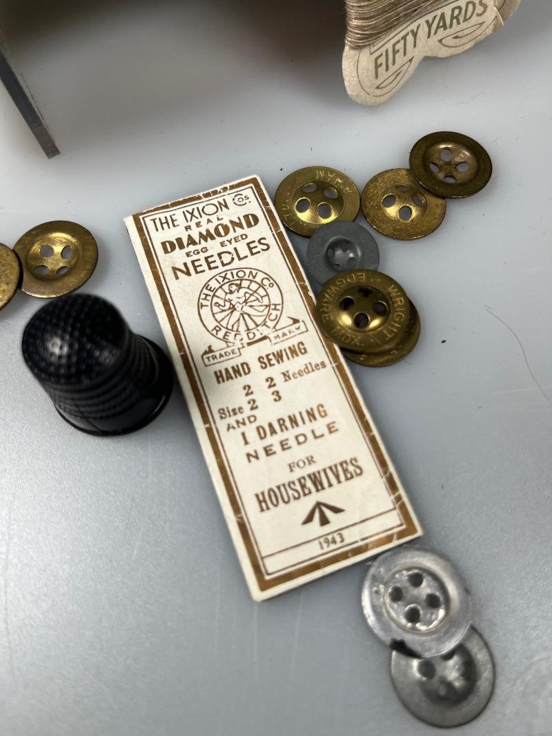 The WW2 British army Housewife, or ‘Hussif’, was issued to all troops to enable them to carry out running repairs in the field. This example has no markings; however, it does contain a 1943 dated packet of 5 needles, 4 for sewing and one for darning. It also contains two balls of darning wool, fifty yards of sewing thread, ‘Bakelite’ thimble and a range of brass and steel buttons from various manufactures.