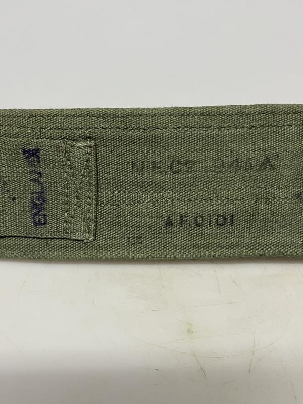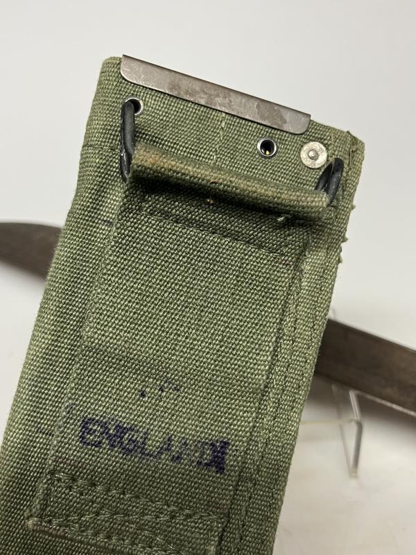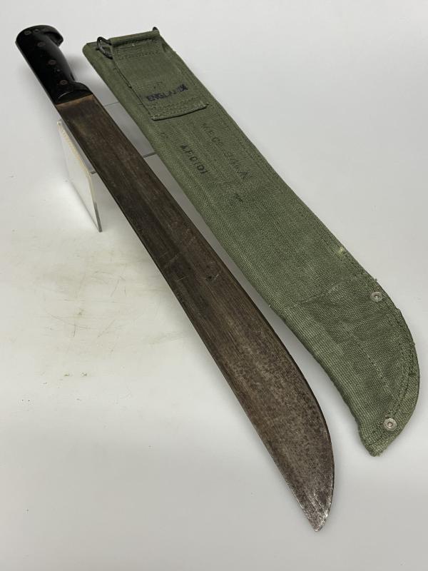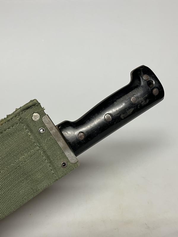 This late war machete was part of the 44 Pattern equipment, designed for jungle use in the Far East, and featured an American style webbing scabbard with wire hanging loops designed to work with the grommets found on 44 Pattern belts and haversacks.