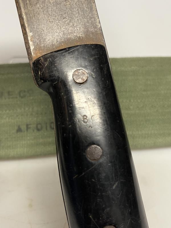 The blade was 17.5” long with an overall length of 22.5”. The machete itself has black plastic grips and marked with a code of ‘AF 0100’. At least six British manufactures have been identified during 1945.