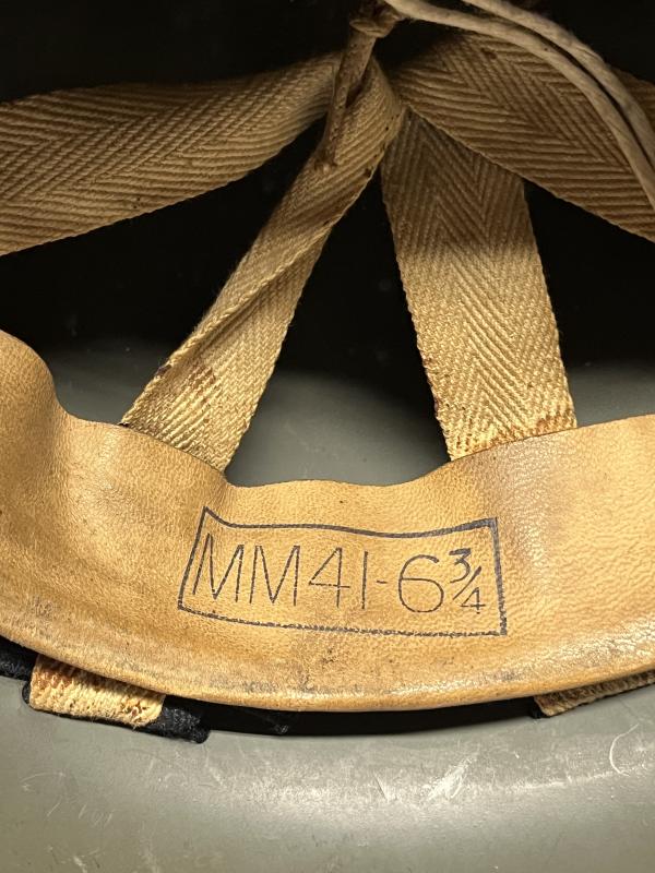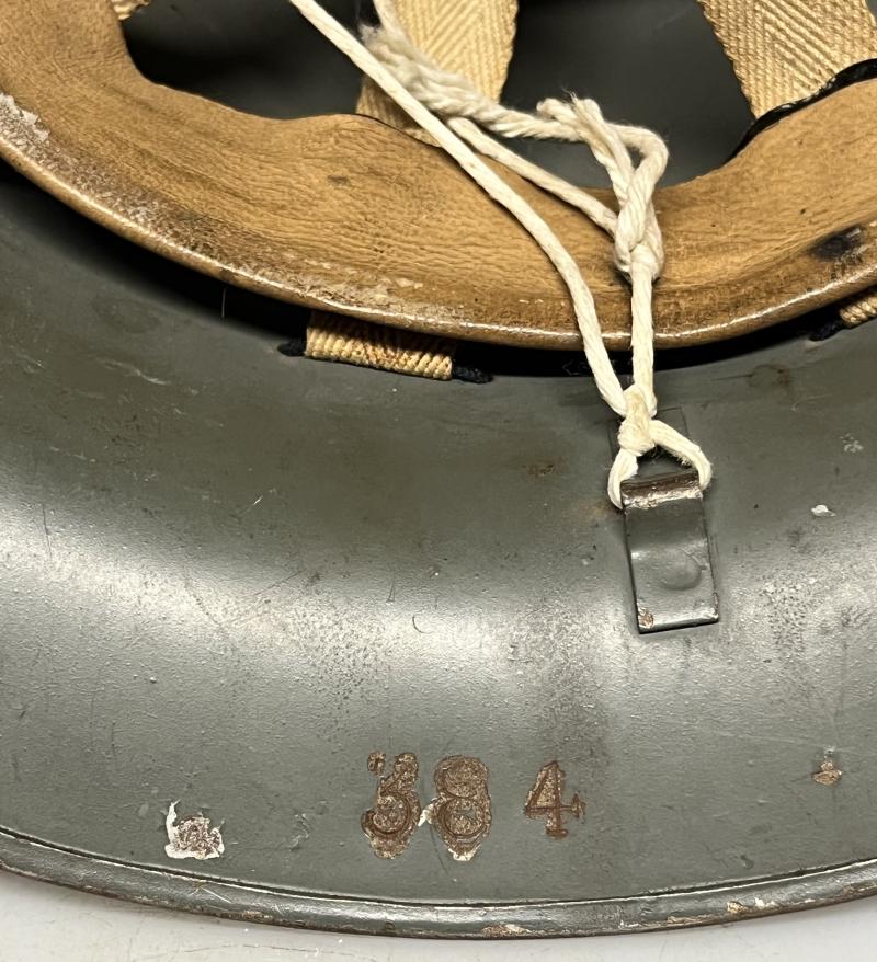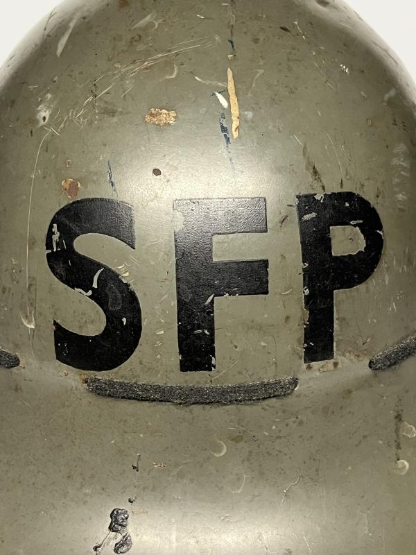 This example retains its factory grey green finish with the addition of ‘SFP’ stencilled to the front. The liner dates to 1941 and was manufactured by ‘M.M.’ to a good size 6 ¾. Supplementary/Street Fire Parties were active until the end of 1943 when replaced by Fire Guards.