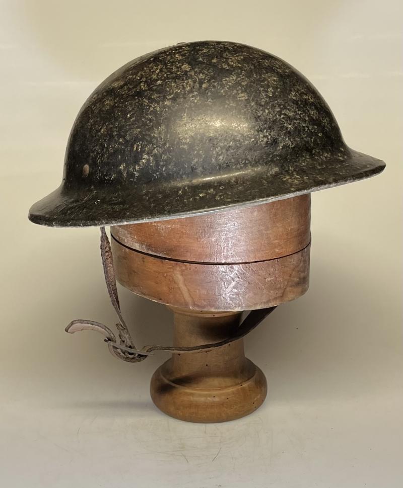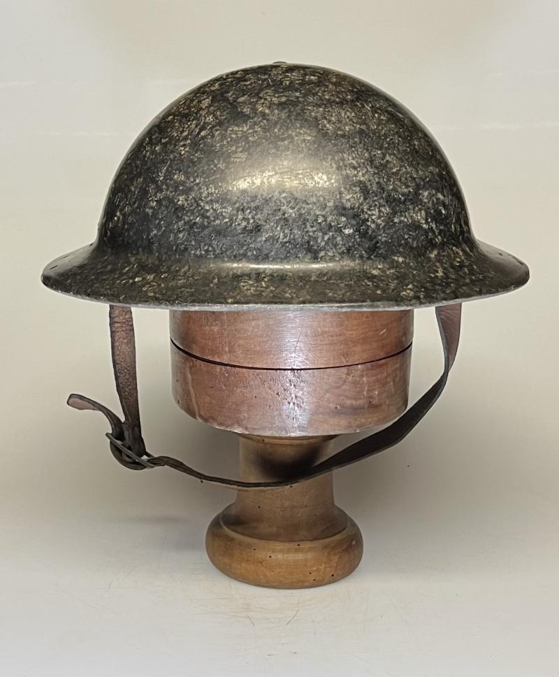 Several commercially manufactured helmets were targeted towards the civilian market during WW2. Some were adopted by factory workers, especially those working in munitions as sparks could be avoided. Emulating the shape of the MkII steel helmet they provided rudimentary protection but had a psychological benefit. Some were made from Bakelite and others from lightweight alloy or composite fibre.