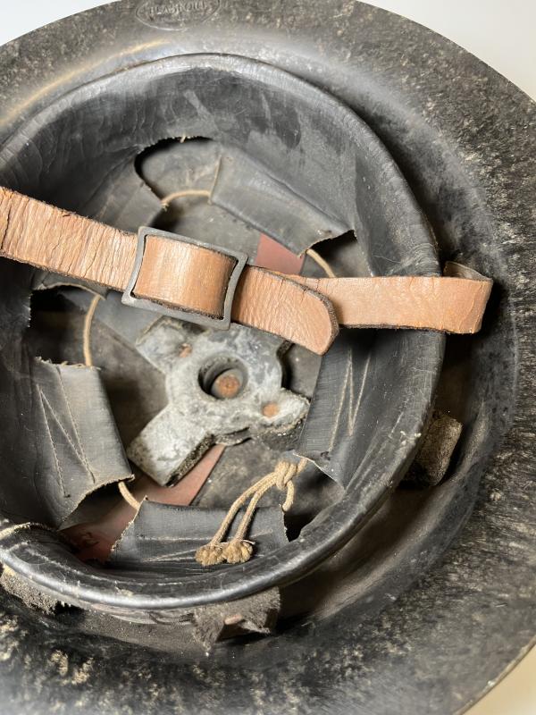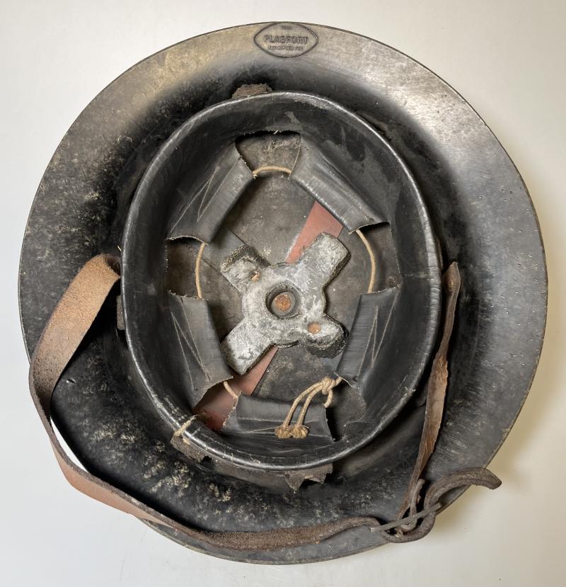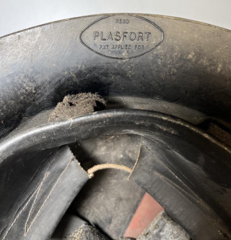The ‘Plasfort’ design dates to 1940, the shell was compression moulded from phenol formaldehyde with a raised moulded logo, ‘REGD PLASFORT PAT APPLIED FOR’, on the underside of the rim. It was thicker than the usual steel helmet but utilised some component parts used in military helmets such as liner and chin strap.