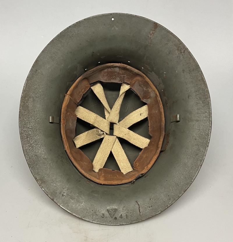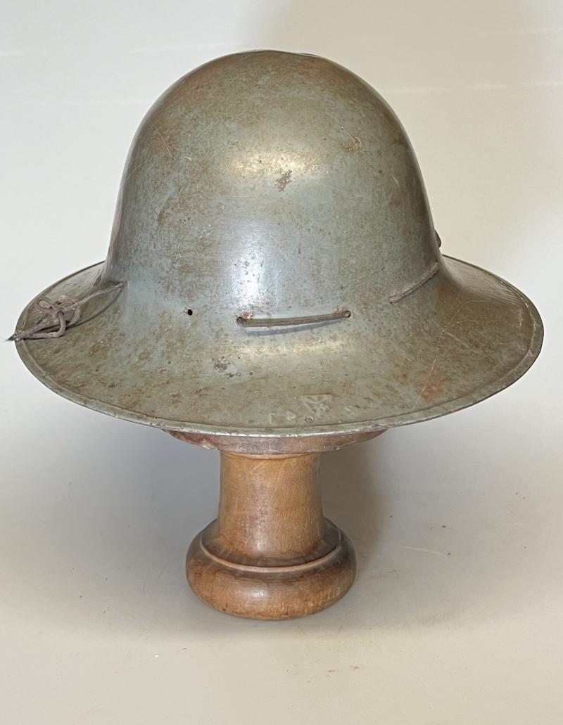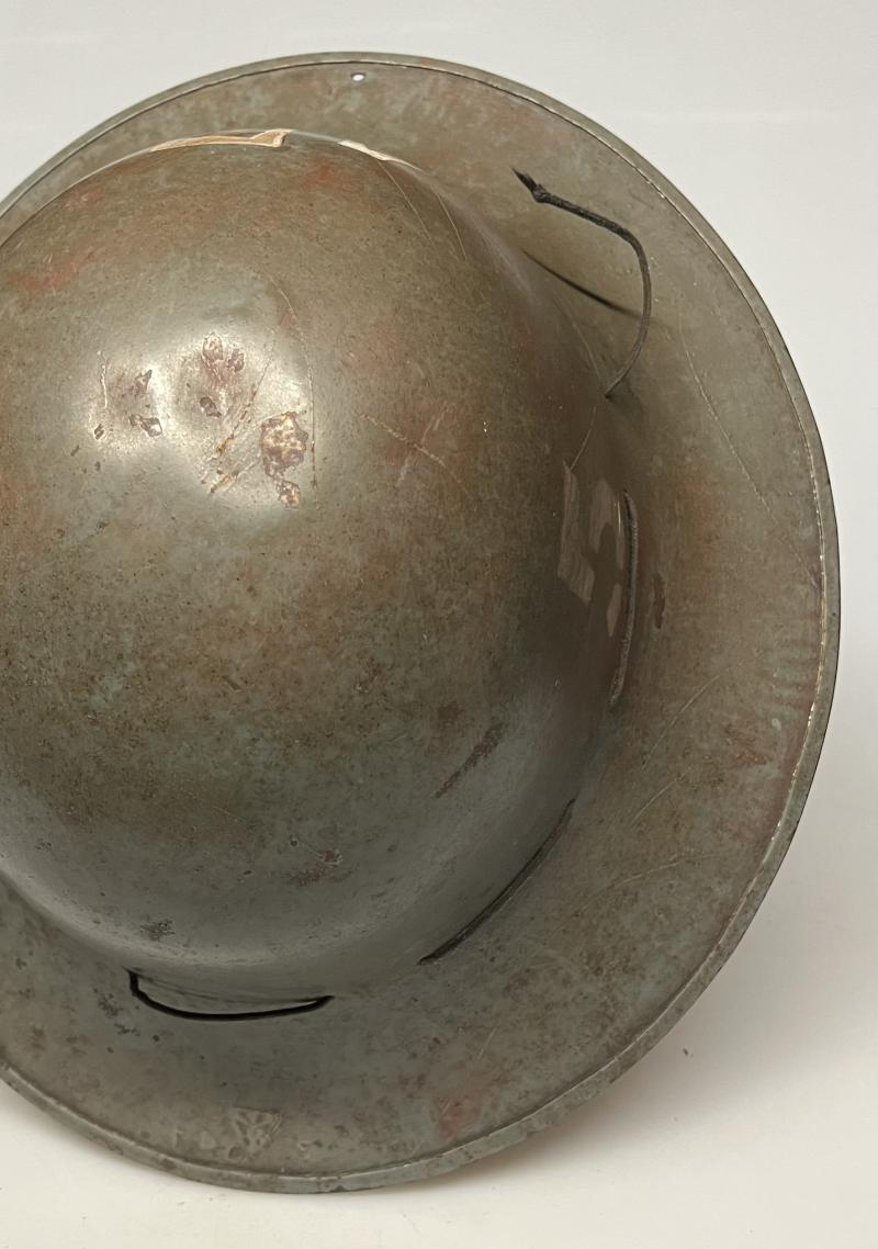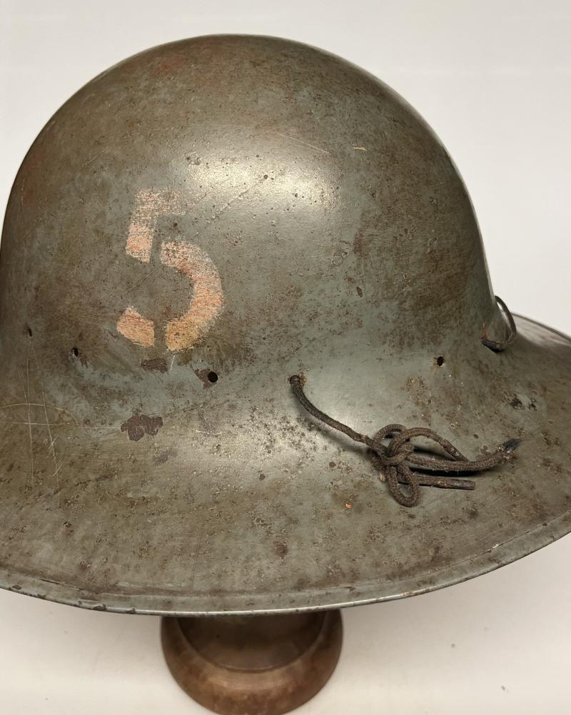 This ‘Zuckerman’ was manufactured by PSC (Pressed Steel Company), dates to 194,1 with the application of AFS (Auxiliary Fire Service) to front with the addition of the number ‘5’ applied to the sides. The helmet is in good order apart from the ‘lace’ holding the liner in place which has almost rotted away, I am leaving ‘as is’ and will let the new owner decide on whether to replace the lace.
