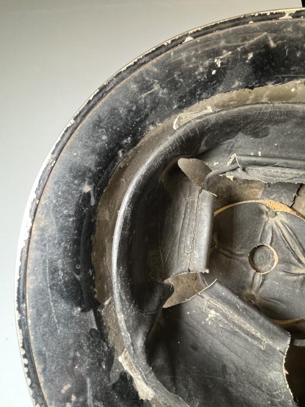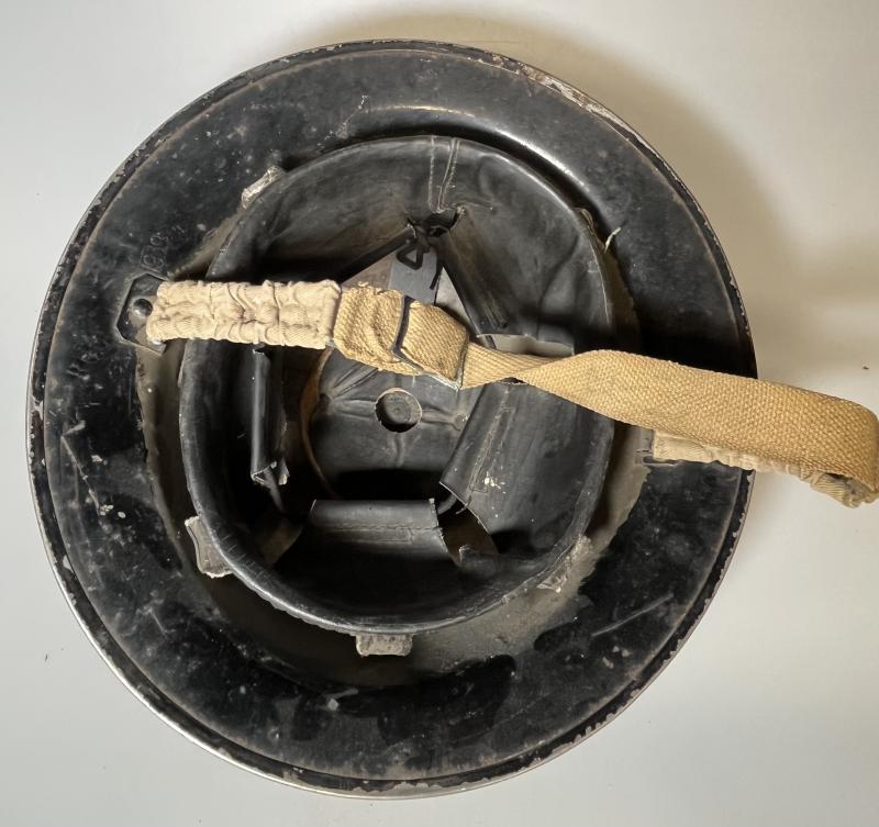 A Warden’s helmet from outside London, as designated by having the logo placed to the front of the helmet only, in ‘salty’ condition with some paint loss but with bags of character, if only it could tell a story!! With a good sized 7 liner produced by ‘VERO’ in 1939 (the helmet maker mark is obscured) it displays very well.