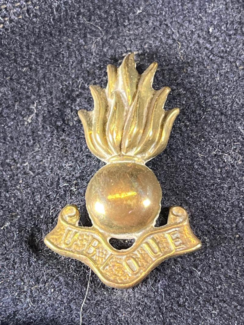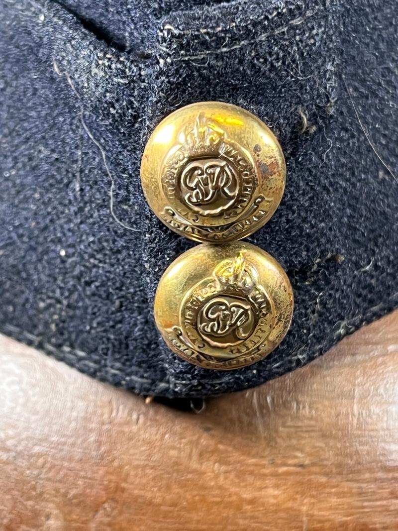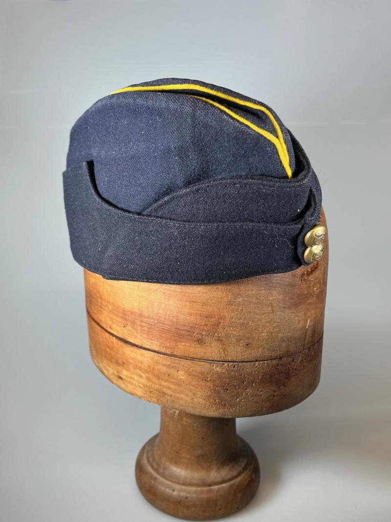 This example is coloured and badges to the Royal Engineers with dark blue crown, body, peak and curtain with yellow piping to the crown. Badges with the Royal Engineers grenade. A well-worn solid example with little to no mothing.