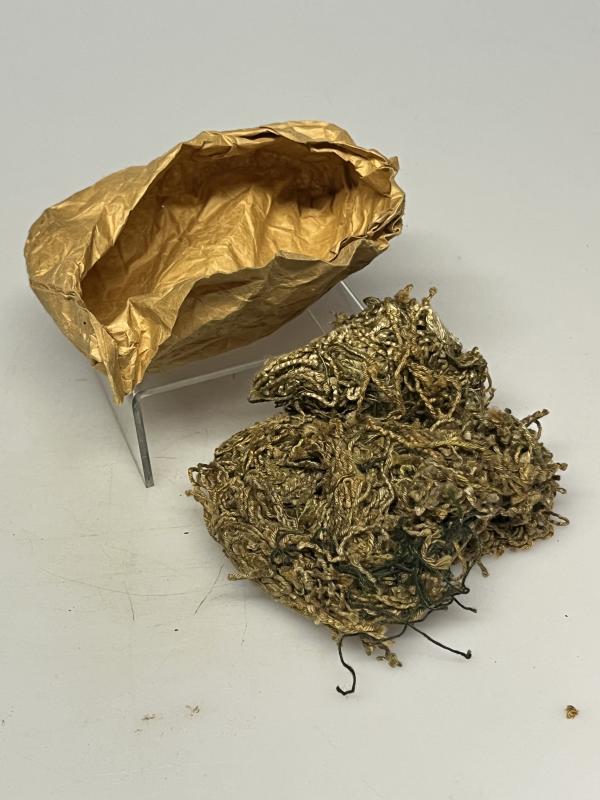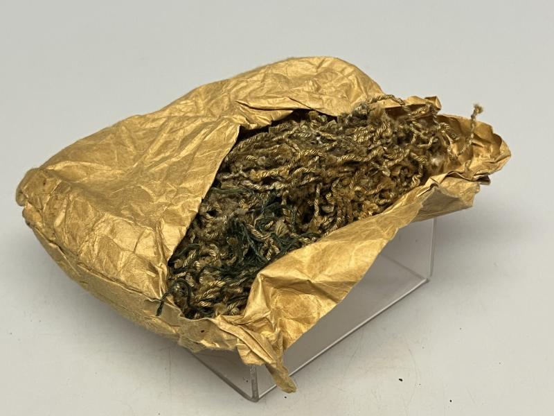Interesting in the fact that it is held in a period brown paper bag/envelope and appears to be made from the waste produced from helmet nets.