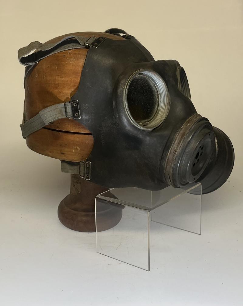 The Light Respirator was introduced in 1943 and was to replace the General Service Respirator. Available sizes were ‘Small’, ‘Normal’ and ‘Large’ and can be identified by the word being moulded onto the outer mask. The harness was, to save on rubber, from cotton webbing with elastic straps sewn directly onto it. The container filter consists of a metal drum with a threaded neck on one end with a 1” inlet hole on the other.