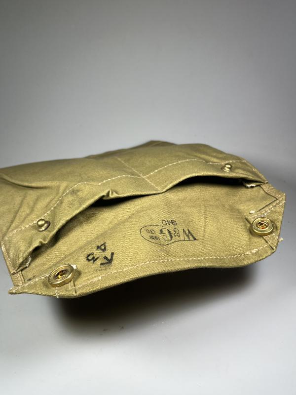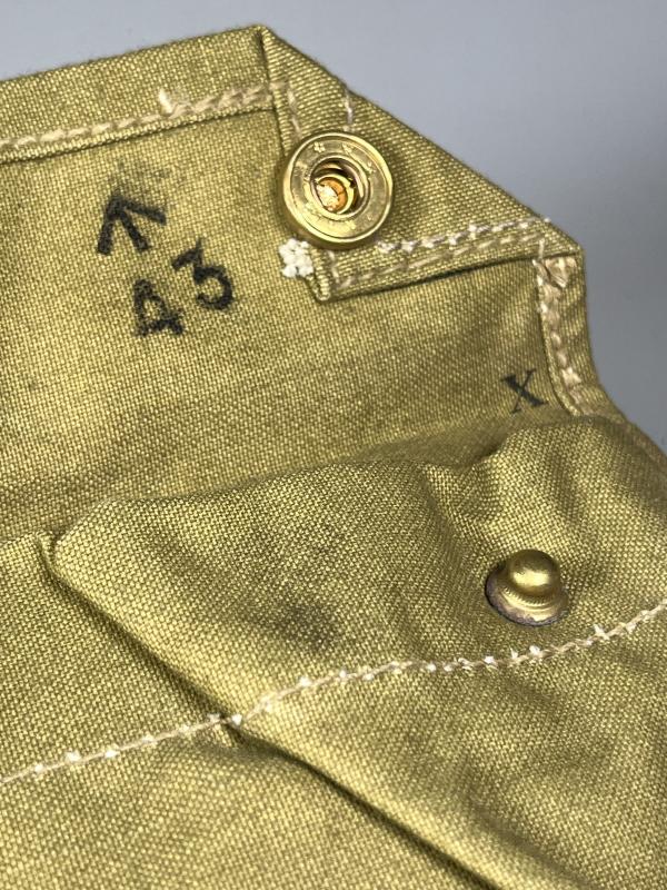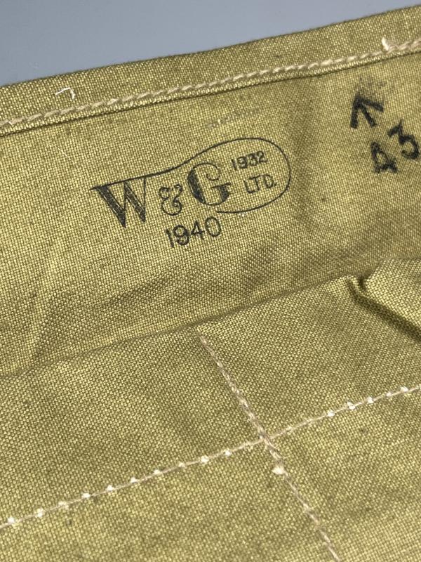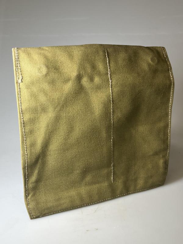 A need for extra pockets on the haversack came about in 1939 when the anti-gas eye shields and anti-gas ointment became standard issue. To accommodate this need another bag was created that had two pockets and a single closing flap with a pair of press studs. This bag was intended to be sewn onto the front of the haversack with the new designation ‘Haversack Mark V-C for converted.