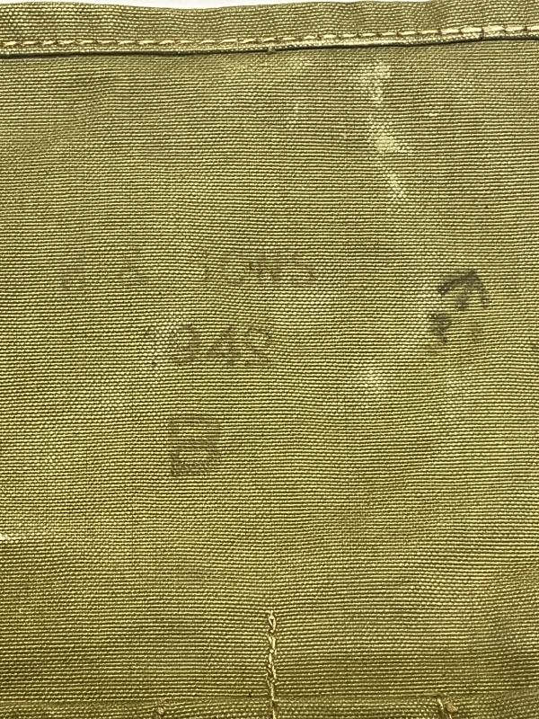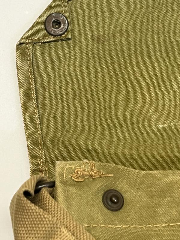 In a further effort to economise production the Haversack Mk VII was introduced in early 1941. It eliminated the second closing flap by moving one set of pockets into the inside of the bag and number of metal drain vents to the base was reduced to two. Other changes included the inclusion of a small pocket for the newly designed ant-dim cloth tin that allowed for easier access, the haversack strap was further simplified by eliminating the metal hooks and a small pocket was added near the bottom to hold the whipped cord which held the bag close to the chest during the alert position and was fixed using a new metal, quick release tying disk.