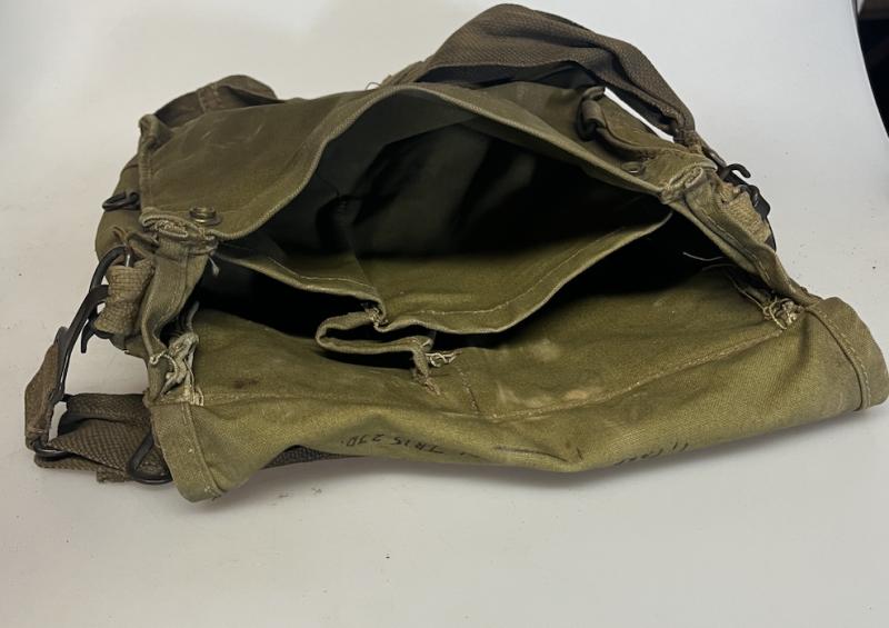 The MK VI Haversack was introduced to simplify the MK V plus additional pockets for the newly standard Eye Shields and Anti-Gas Ointment. The strap was made simpler with added metal hooks to attach to the D-rings allowing it to be changed if damaged.