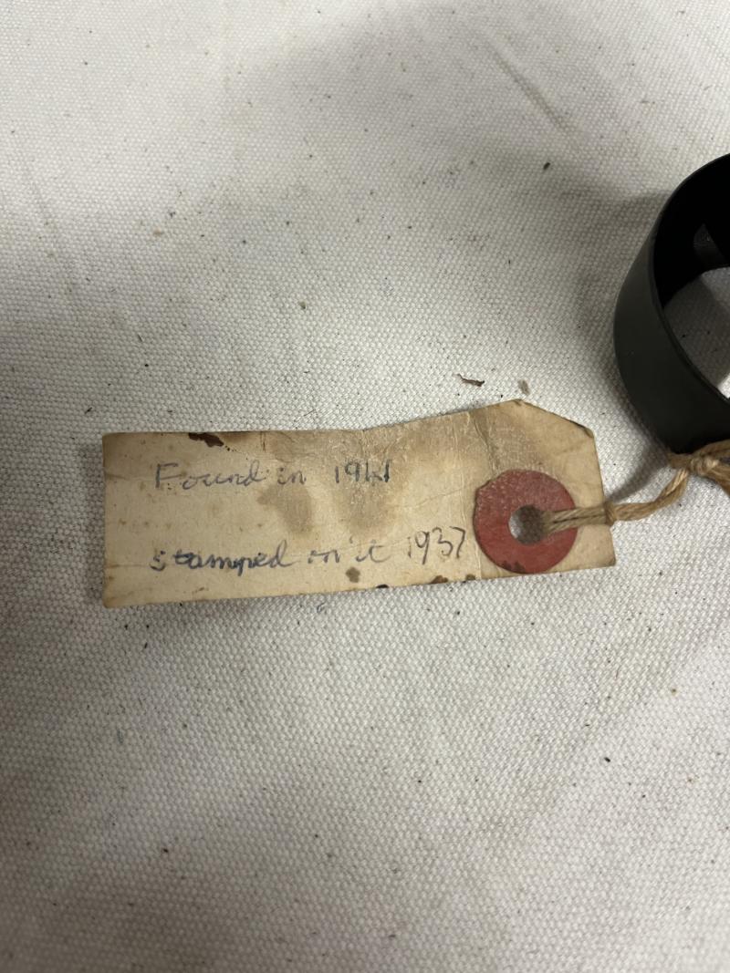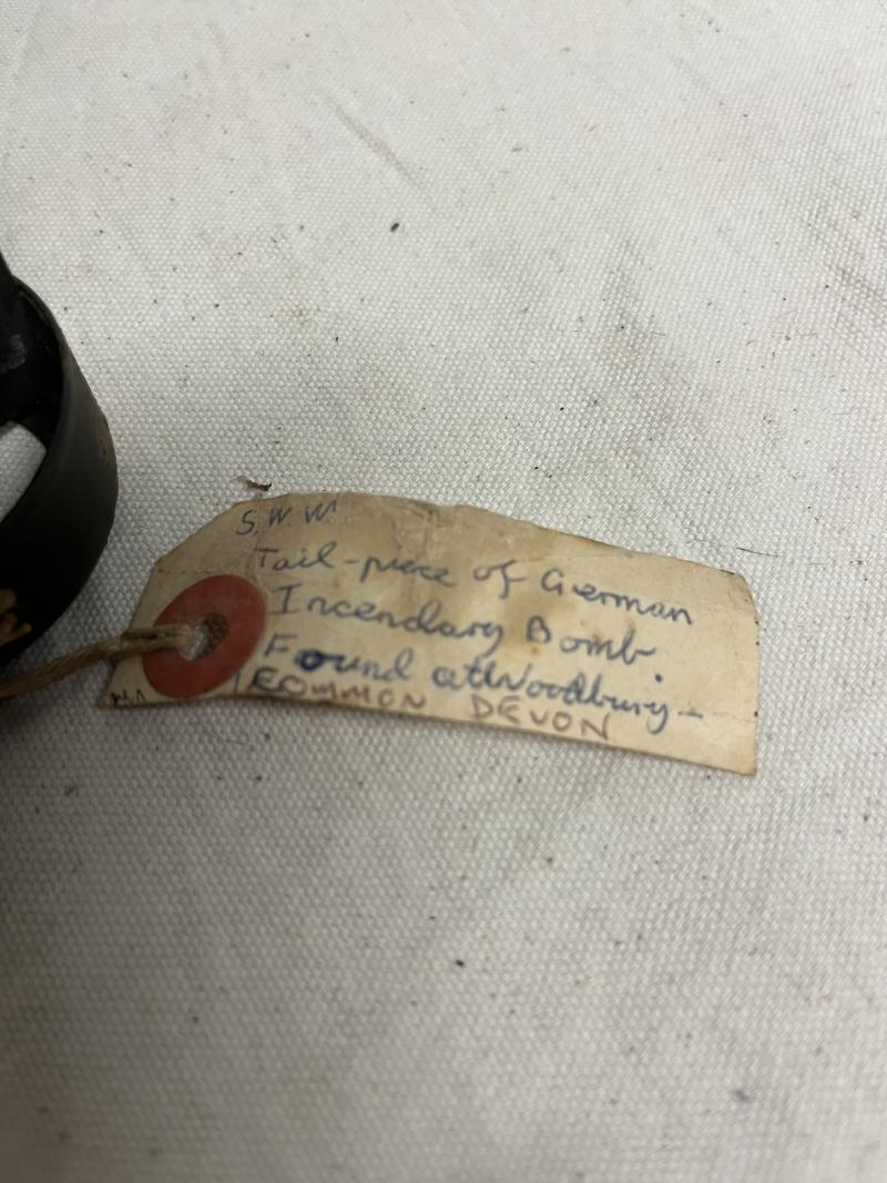 Relic tail fin that fell on Woodbury Common, 7 miles Southeast of Exeter, no drop date but found in 1941 and manufactured in 1937. Some paint loss to the base from the heat of the burning bomb.