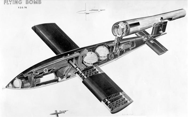 Powered by a simple but noisy pulsejet, more than 20,000 were launched at British and continental targets, mostly London and Antwerp, from June 1944 to March 1945. It carried a one-ton, high-explosive warhead and had a range of about 240 km (150 miles) but was, however, very inaccurate. At the impact site houses or buildings were totally demolished and destroyed. In the inner London suburbs where terrace houses were packed together, sometimes up to 20 houses would totally collapse, just at one hit. Brick walls were pulverised into small fragments.