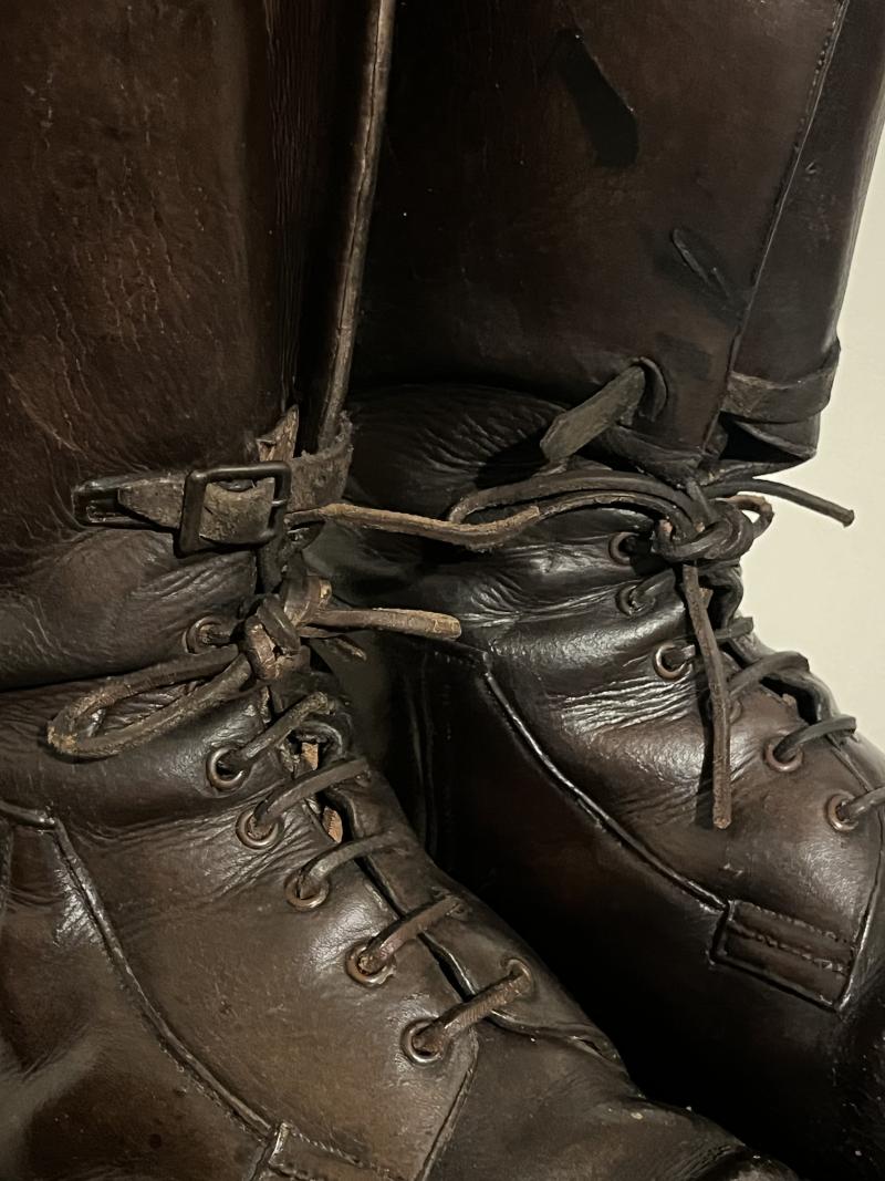 The boots are in overall good order; however, four of the six leather straps have snapped at some point with some wear to the sole. Both boots have RD70 heel plates in place and appear to have the original soles.