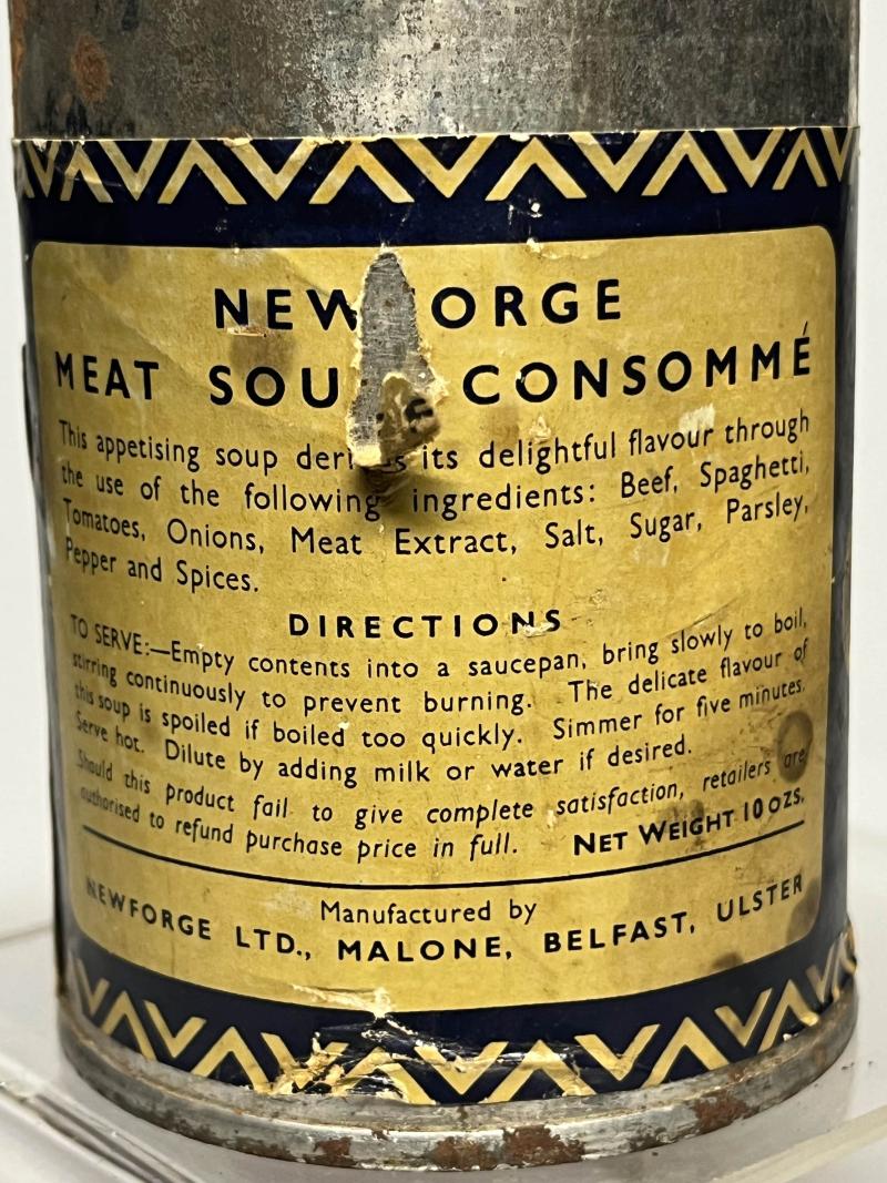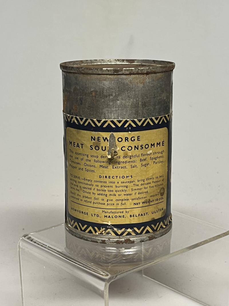 An unopened tin of Meat Soup Consommé, manufactured by Newforge Ltd, of Belfast and retaining the majority of its war time label.