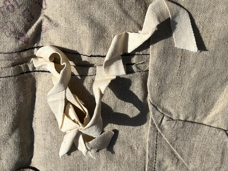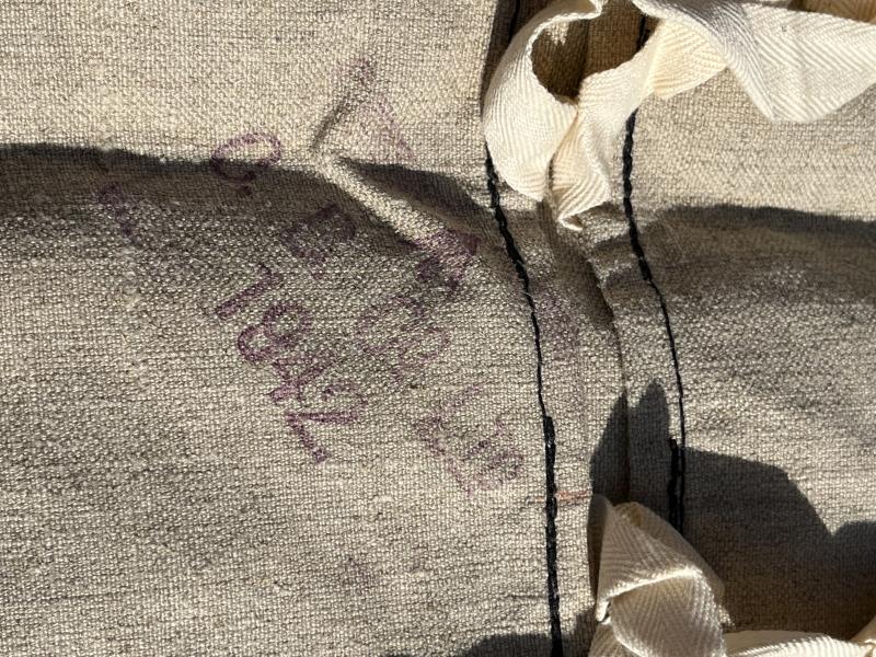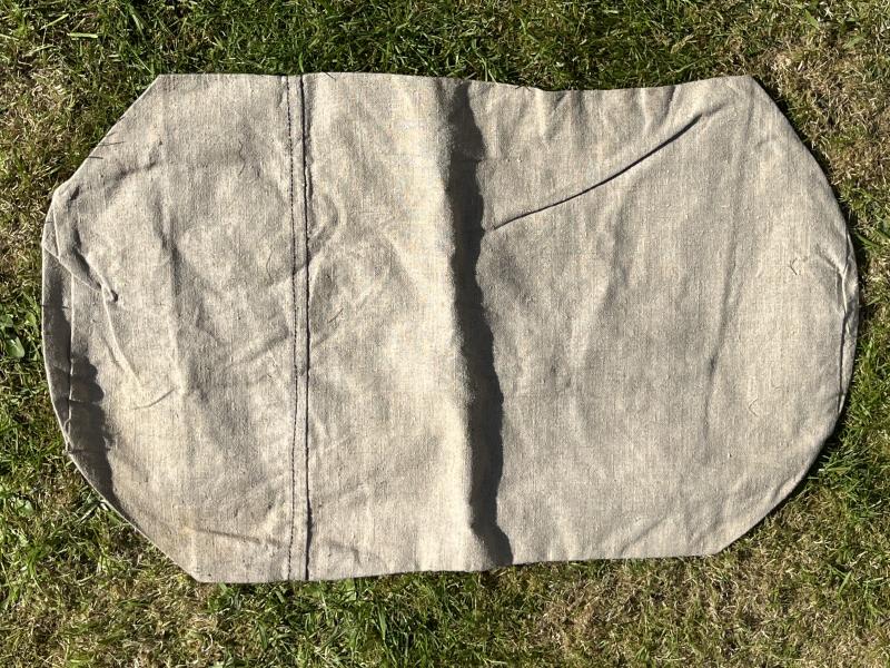 Field pillows of WW2 differed little from those of WWI. They consist of an empty cloth bag with a top or side opening closed by a pair of cloth ties. The soldier would stuff the bag with his own clothing, straw, grass, etc.