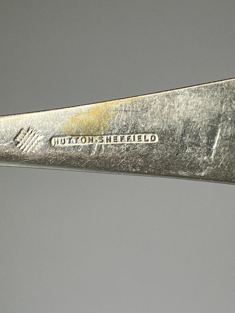 The fork was manufactured by Hutton’s of Sheffield with the markers mark for the spoon being obscured but appears to have been made in Birmingham.