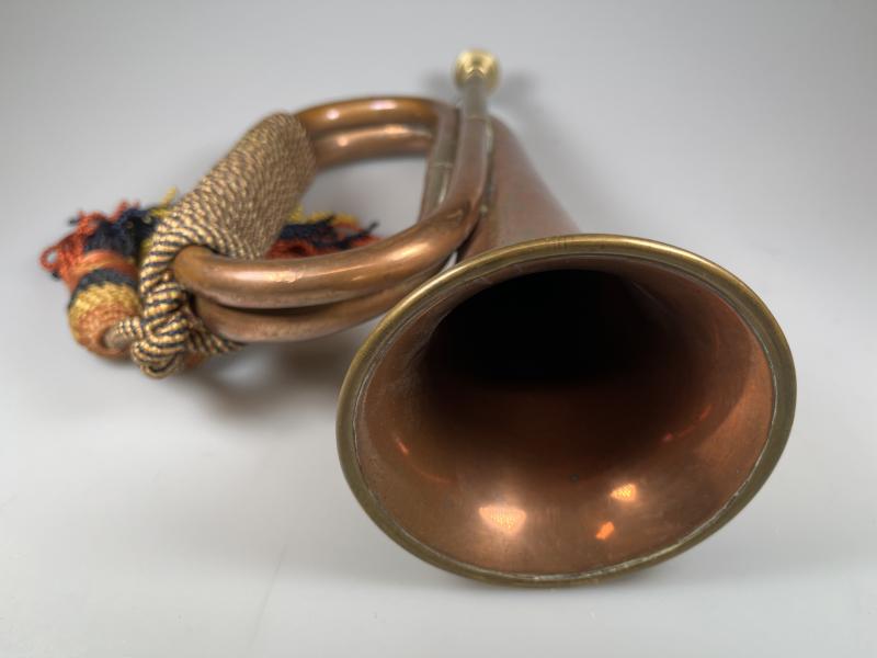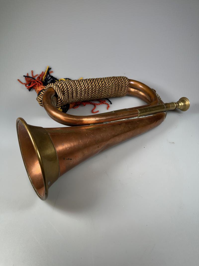 Copper and Brass bugle, possible REME, with a book of bugle sheet music published just prior to WW1 in 1913.