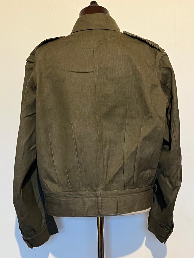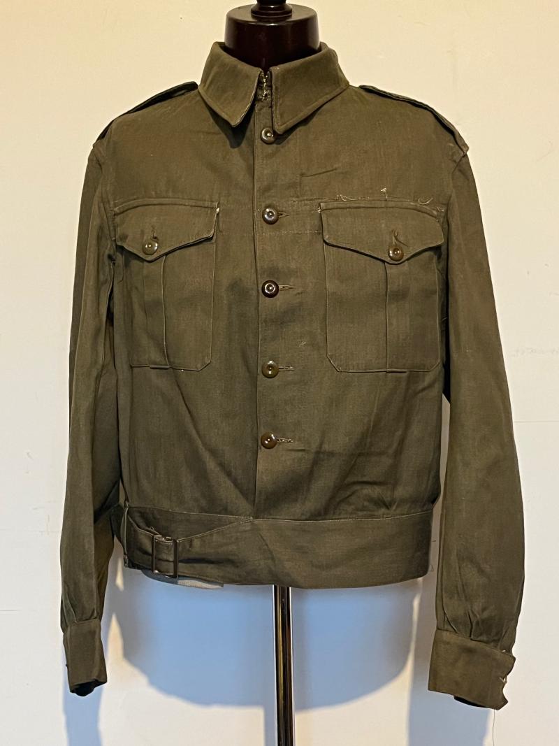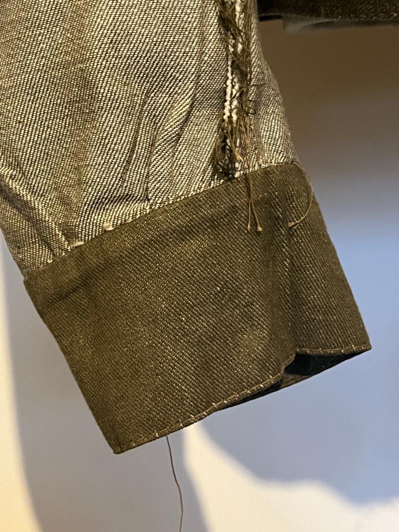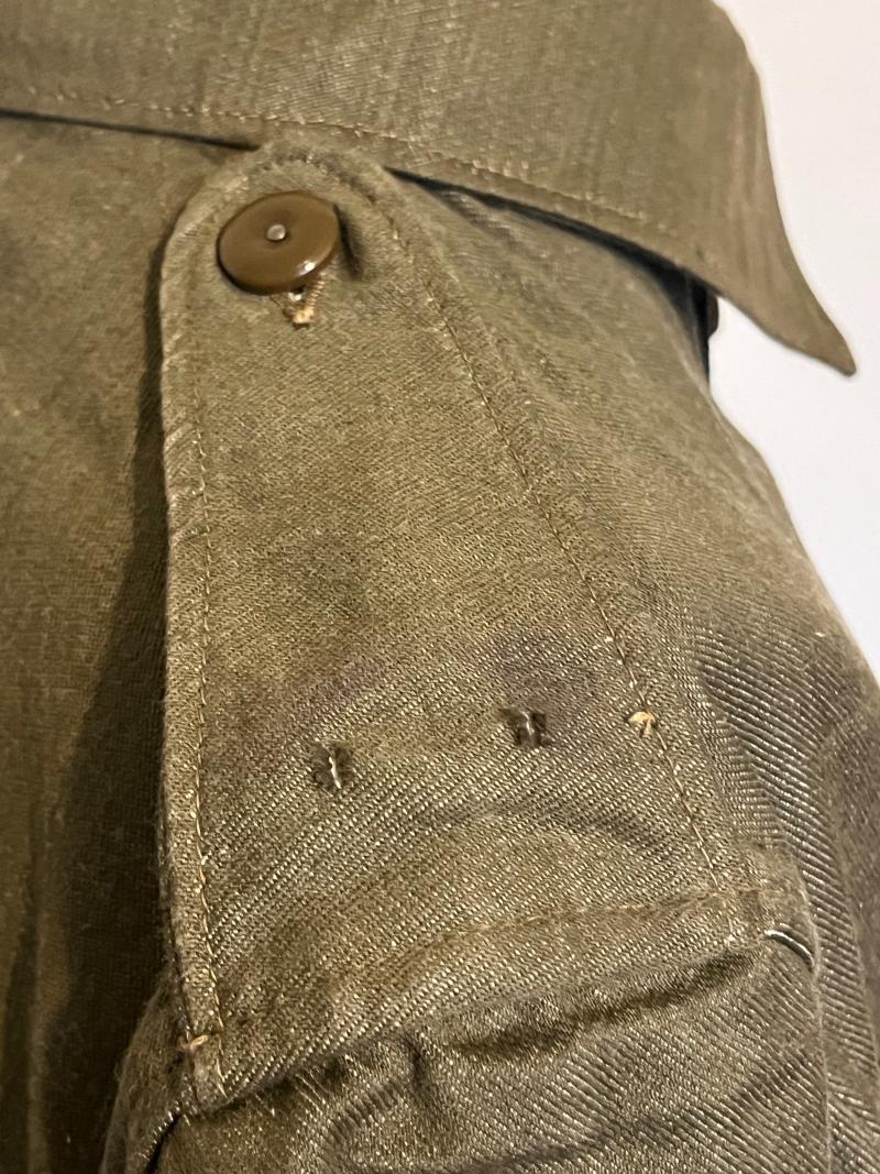 The blouse was manufactured in 1941 by The Osband Knitwear company, having all the original buttons and buckle. There are some very light ‘oil’ stains to the right-hand sleeve and breast pocket plus evidence of insignia being applied to the shoulder epaulette, otherwise the blouse is in exceptional order. Priced to reflect the exceptional condition and sizing of this hard to source item of uniform.