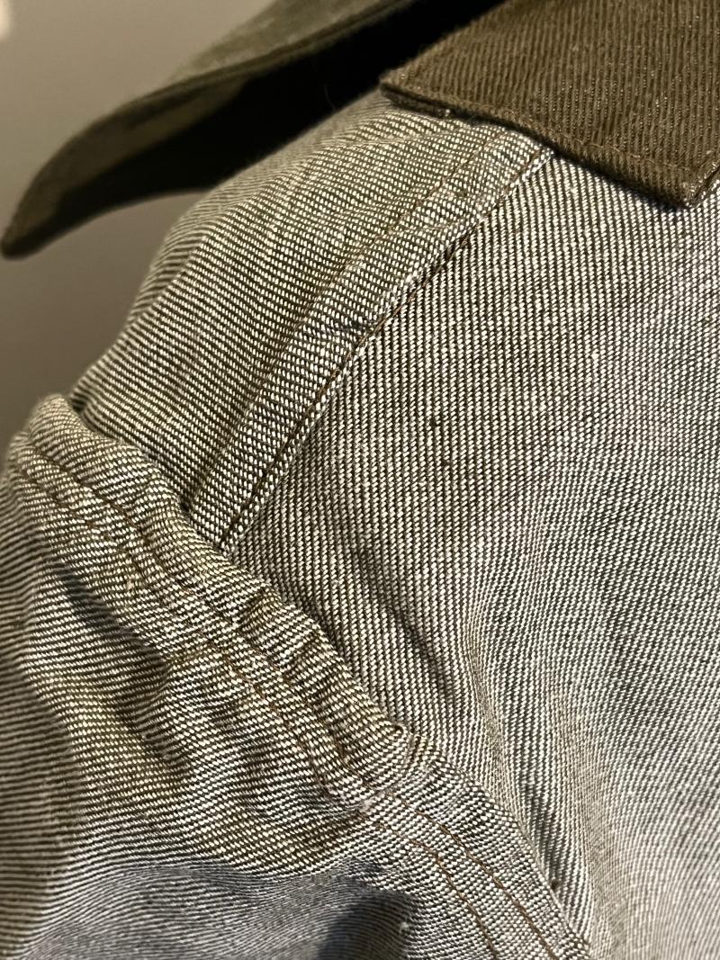 Denim overalls produced early in the war have the same looks as the Battledress Serge, while later they followed similar changes as to the 1940 Austerity Battledress. These two-piece utility uniforms were made from Denim and used removeable, revolving shank buttons to avoid damage whilst laundering. As with the single piece overalls they were designed to be worn over the usual uniform to aid protection.